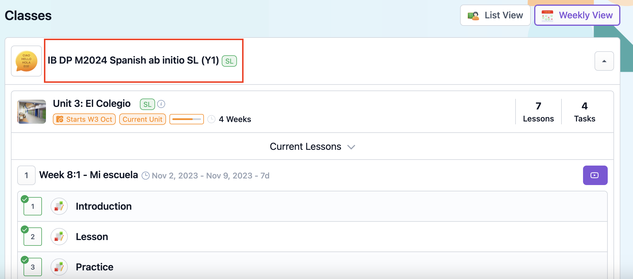 2. Click on your Class name at top, beneath the Weekly Planner - for example “IP DP M2024 Spanish ab initio SL (Y1)”