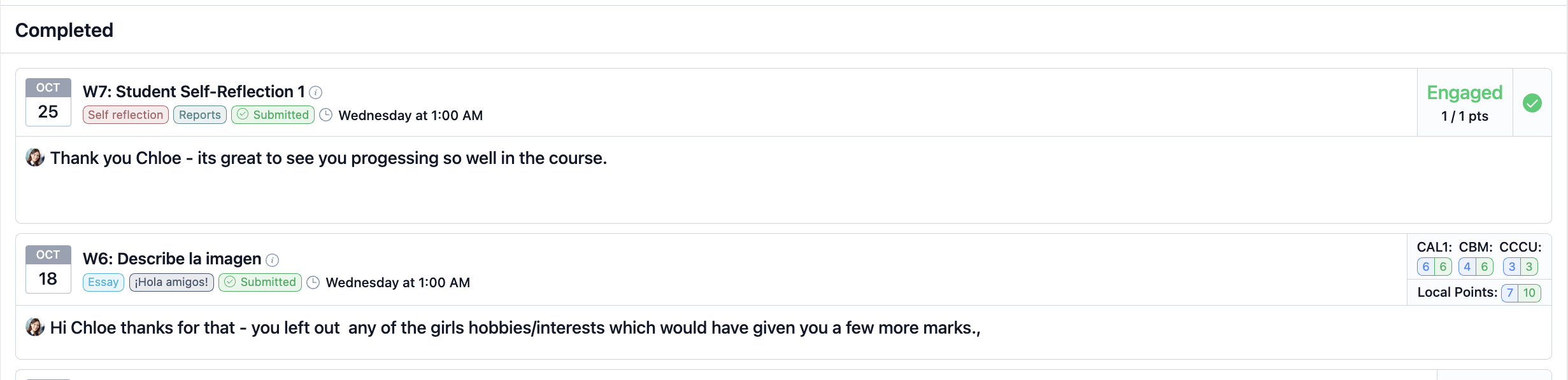 4. Under the 'Completed' section of the page locate all assessed work to review teacher feedback and awarded grades:
