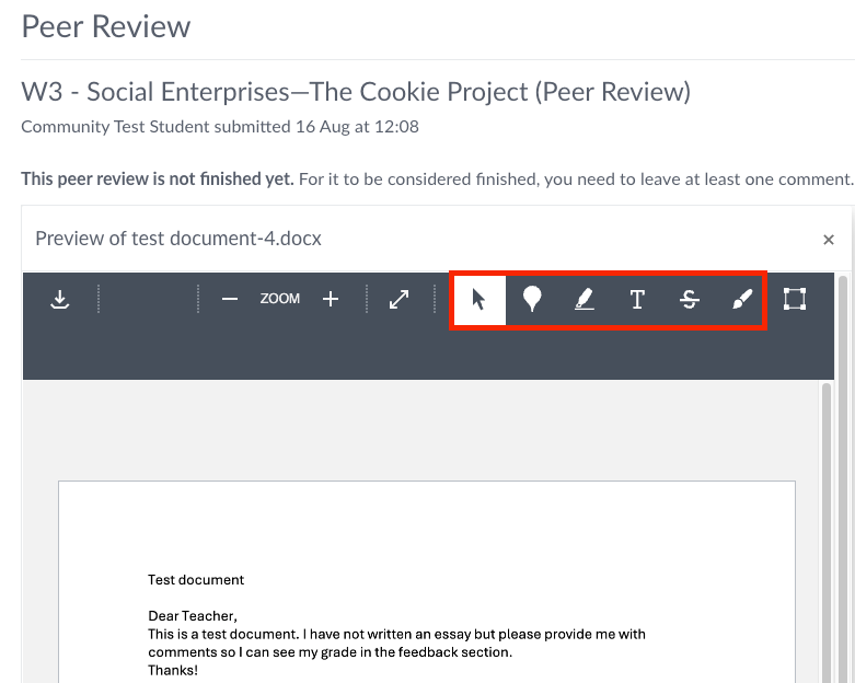 At the top of the window, you will find annotation tools (highlighted in the red rectangle) that you can use to comment or mark the submission as needed.