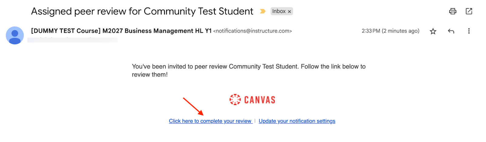 Once you have submitted your work and the task deadline has passed, you will receive a notification email for each Peer Review task assigned. These will be titled “Assigned peer review for [Your classmate’s name]” from <notifications@instructure.com>, as shown in the screenshot below.