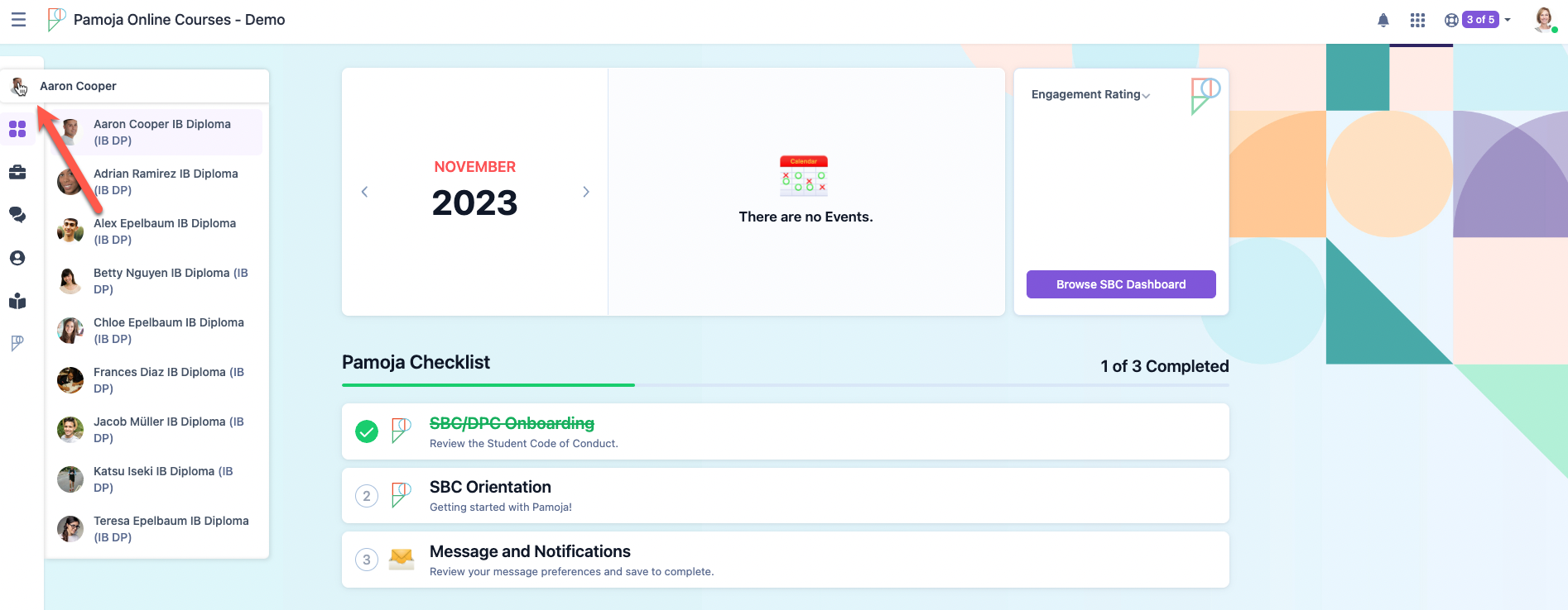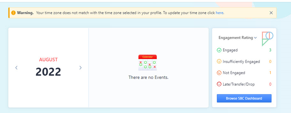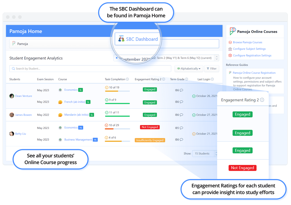 To view detailed information for the Engagement Rating category, click the "Browse SBC Dashboard" button to enter the Pamoja Home Student Engagement Analytics area, where you can check all Engagement Ratings for each individual student in one view.