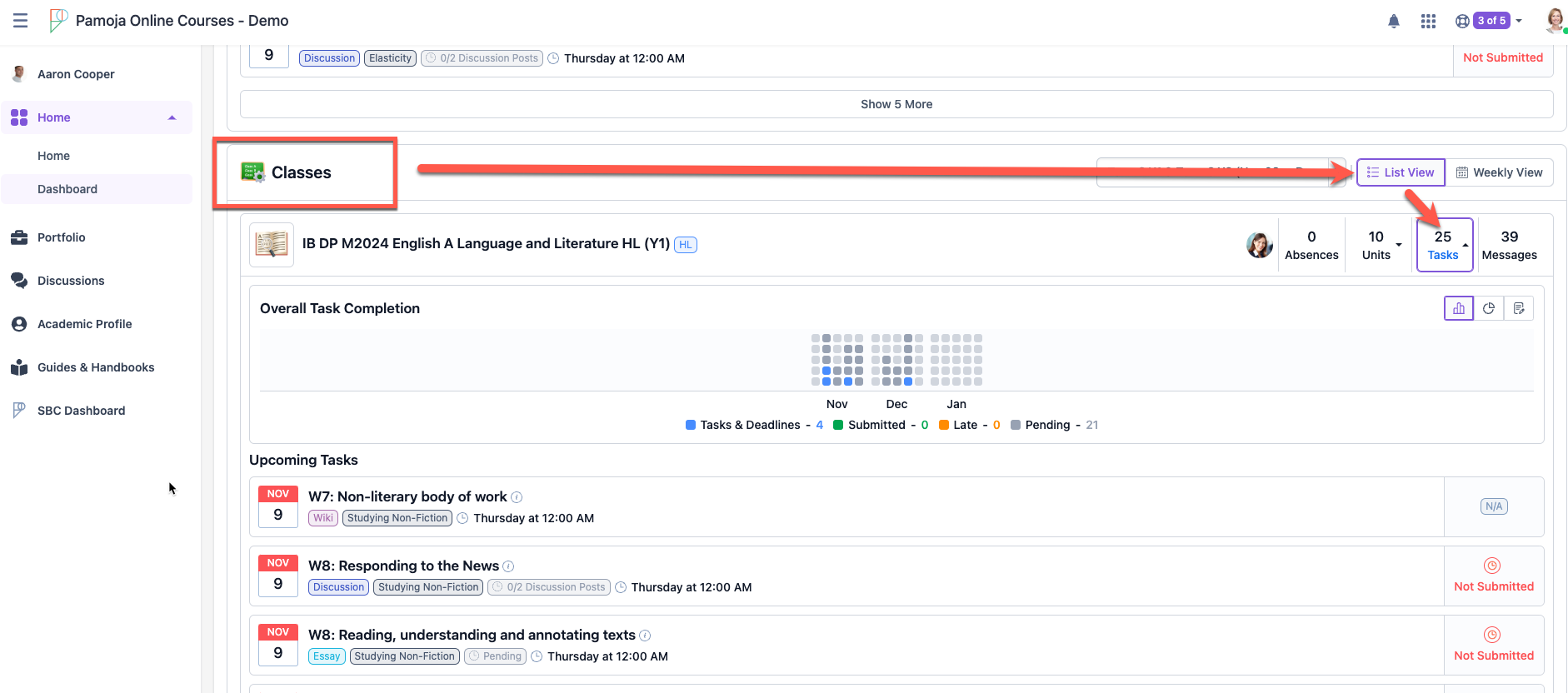 Scroll to the the 'Classes' section. Select the desired term, and 'tasks' dropdown to have a full view of all submitted tasks.