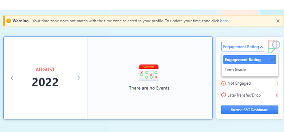 At the top of your account's SBC Homepage you will see the Engagement Rating/Term Grade tile. This will provide at a glance access to the latest awarded grades.