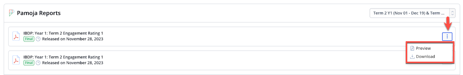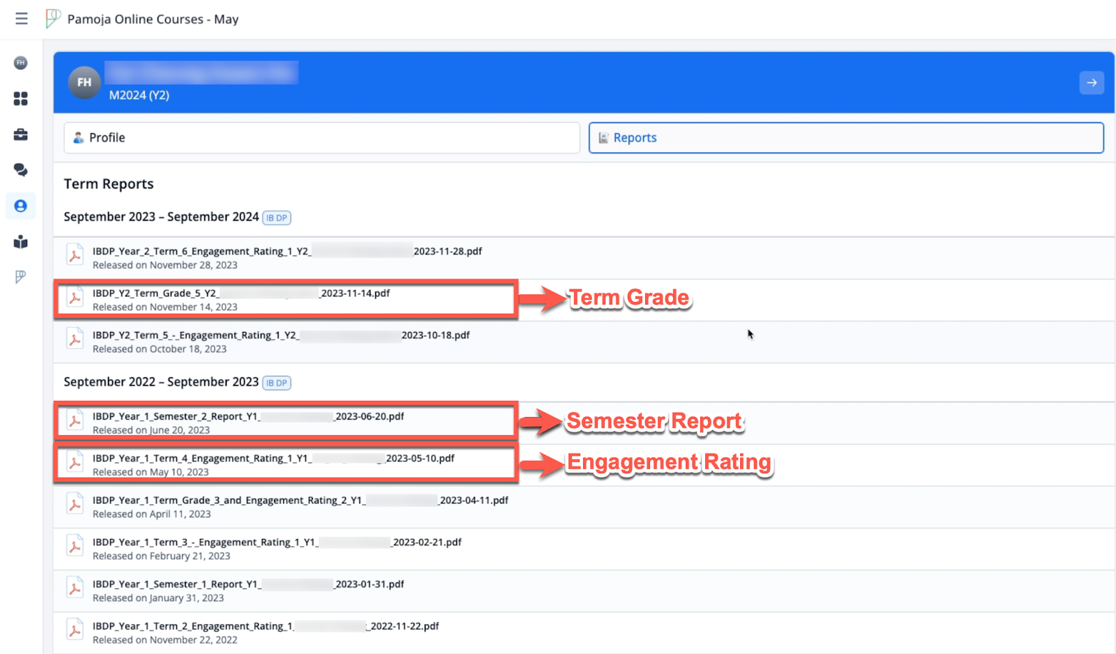 5. Here you will be able to locate all published Semester Reports, Engagement Ratings, and Term Grades. By clicking on the relevant report, it will be downloaded as a PDF.