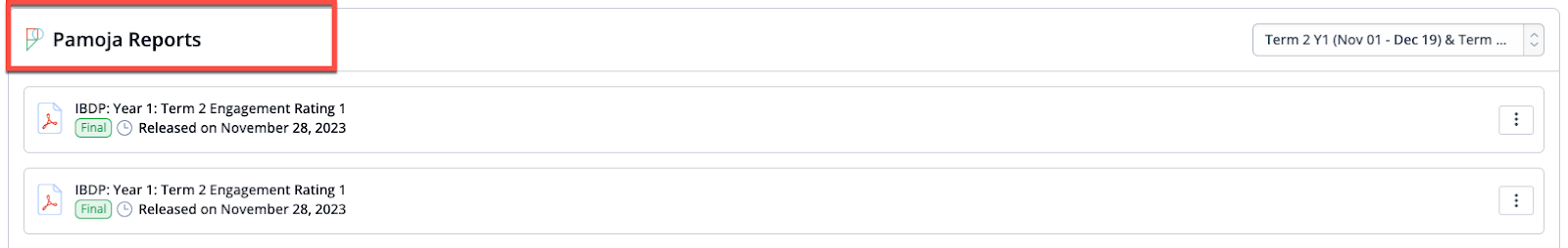 3. Scroll down to the ‘Reports’ section. Select the term that you would like to check. Please be aware the default term is the current term. Then you can locate the Pamoja Semester Reports, other published Engagement Ratings, and Term Grades reports.