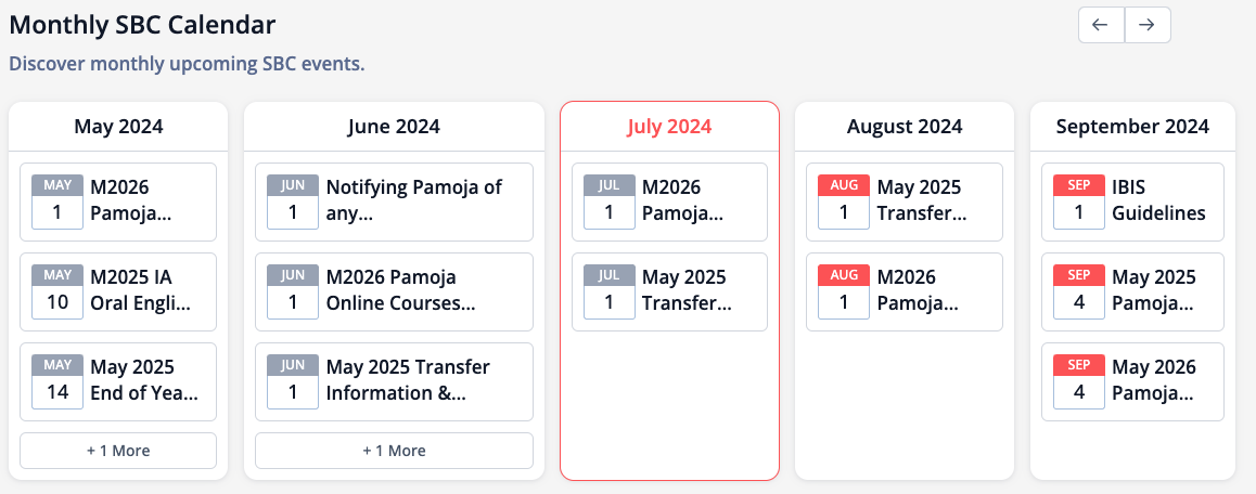Next is the Monthly SBC Calendar, which features notable events in the Pamoja Academic Calendar. Click the links for guidance articles on each event.